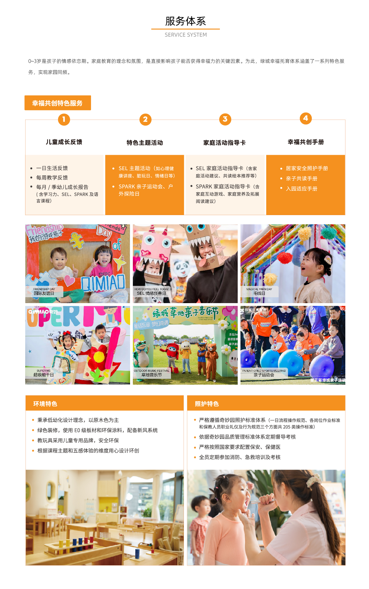 綠城奇妙園,采用全新的“蒙氏+學(xué)習(xí)力+SEL社會(huì)情感學(xué)習(xí)+SPARK兒童運(yùn)動(dòng)+雙語”幸福托育課程體系和幸福共創(chuàng)特色服務(wù)體系,結(jié)合綠城生態(tài)型多元學(xué)玩空間、360度安全防護(hù)體系、專業(yè)的師資和經(jīng)ISO9001認(rèn)證的質(zhì)量管理體系,專注于0~3歲嬰幼兒身、心、腦全領(lǐng)域發(fā)展,致力于培養(yǎng)擁有幸福力的未來世界公民。